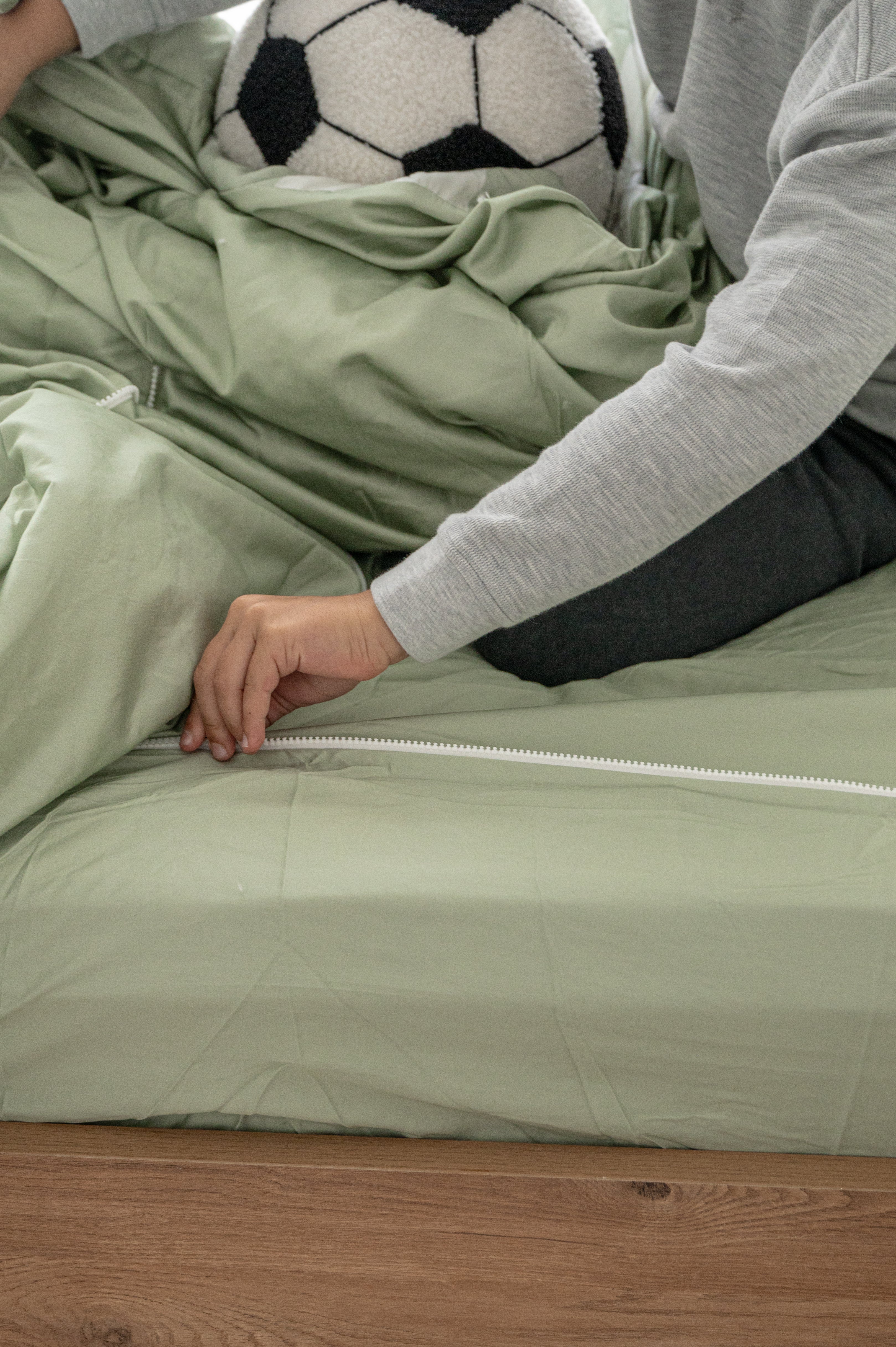 Absolutely. TidyTuck is crafted from premium 300TC cotton sateen, free from harmful chemicals, and breathable for year-round comfort. The hidden zipper is smooth and child-friendly, so kids can sleep safely and soundly